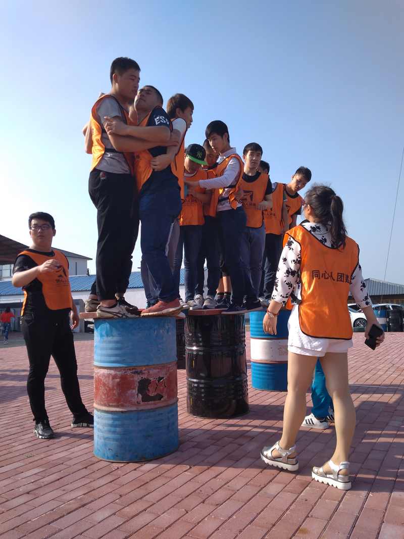 兩個(gè)桶支撐著一個(gè)木板,每組出十二個(gè)人都要站上去,十二個(gè)人緊緊相依,擔(dān)心著,緊張著……