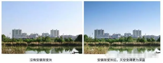 GDN鏡,是這樣的一塊透明的樹脂玻璃,上面從頂部至中間的部分染了灰色,而這個(gè)灰色就猶如Photoshop當(dāng)中的過渡工具拉出來的效果一樣,是從上到下(灰色)逐漸變淡的。而灰色對于光線有均勻吸收的特點(diǎn)。因此當(dāng)我們把這片鏡片放到鏡頭前面時(shí),便會(huì)發(fā)現(xiàn),天空的亮度被減弱了。