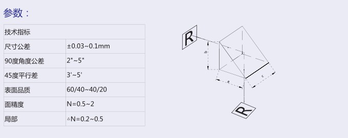 直角棱鏡介紹: 直角棱鏡通常用于將光路進行90度轉(zhuǎn)折,根據(jù)棱鏡方位,像面可被反向,而左右不發(fā)生變化。 如果一個